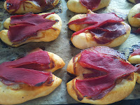 "Huellas de Jamón de Teruel" recién salidas del horno, expuestas sobre la bandeja de hornear, se puede observar la forma característica y la superposición de sus tres ingredientes.